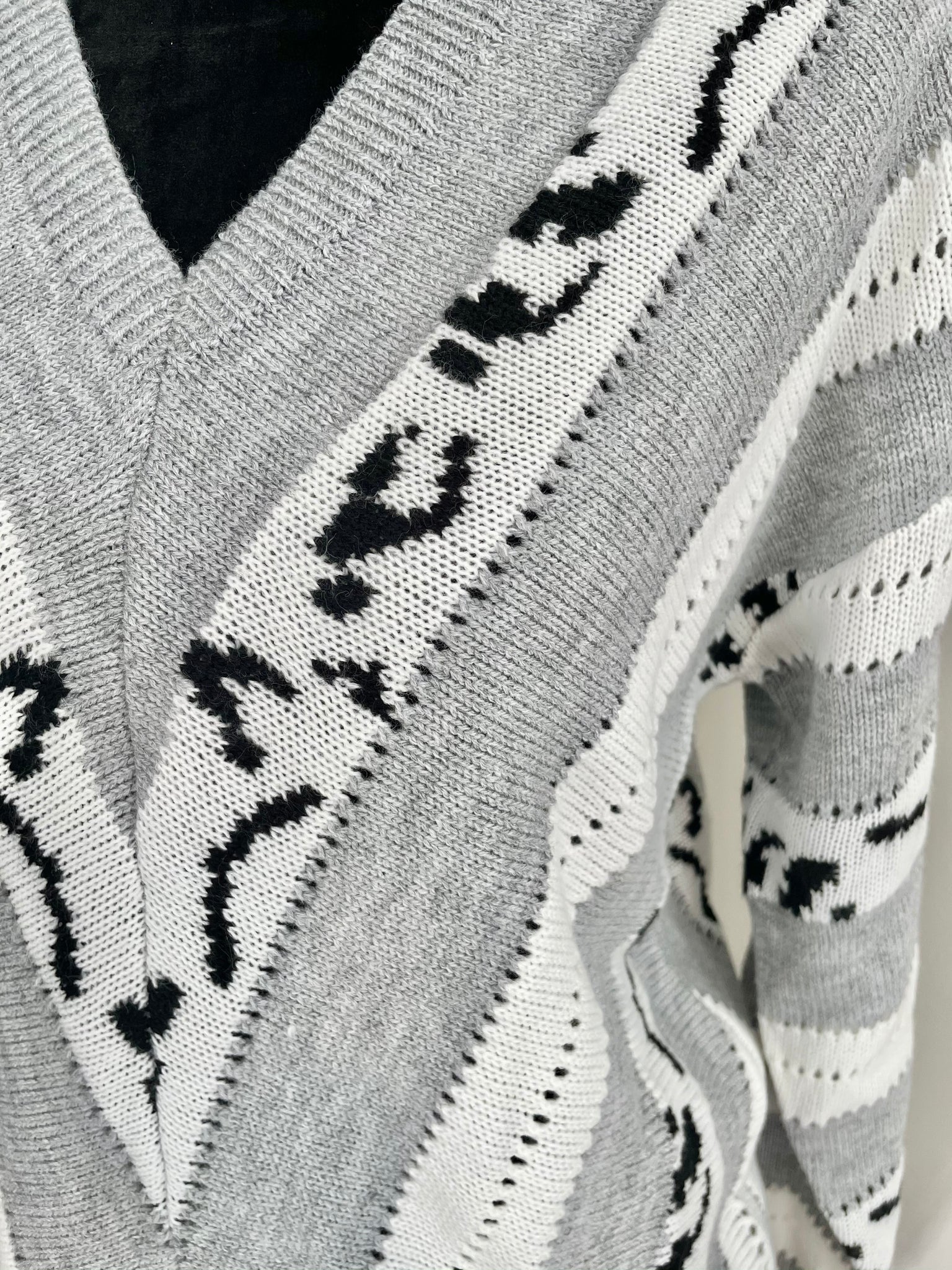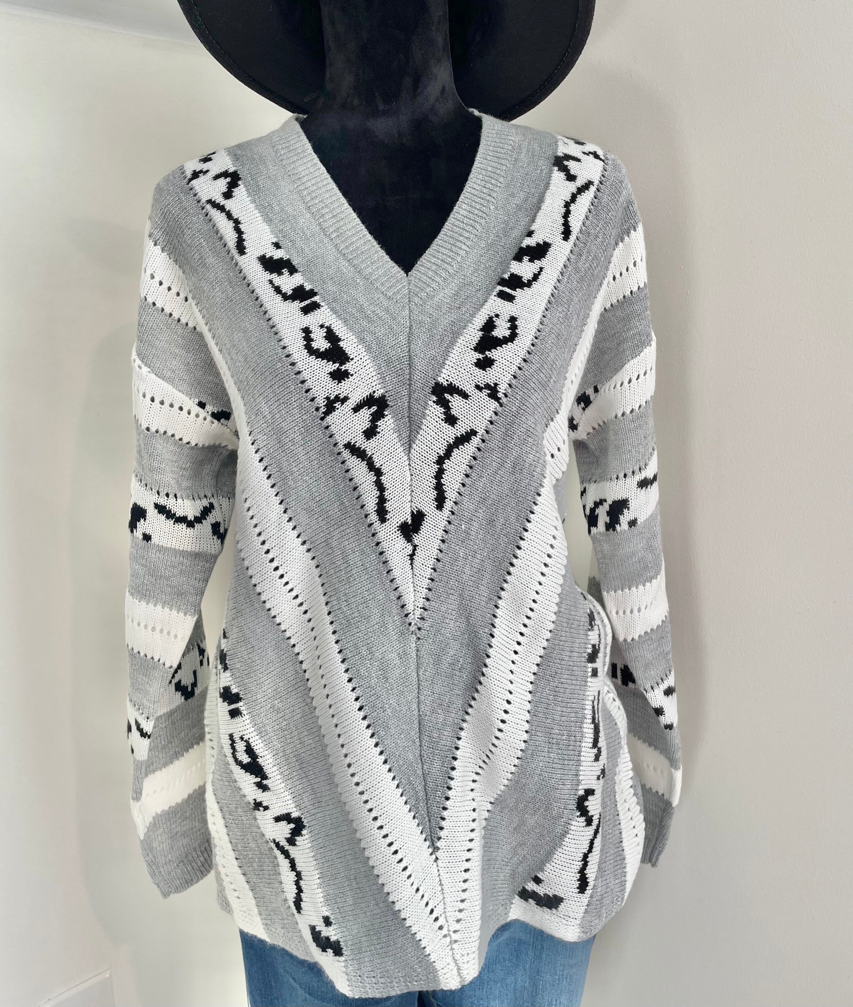 We are loving this sweater with it's trendy, chic leopard stripes and pretty V Neck detail. The length is just right to pair with your favorite mid or high rise jeans, or dress it up for work with you favorite pair of black dress pants!